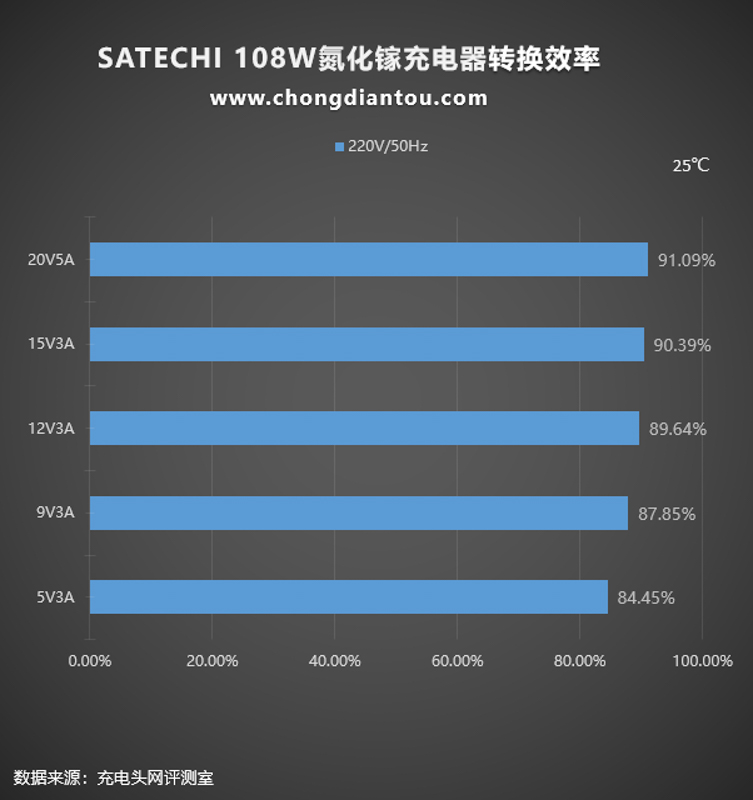 220V 50Hz下,將SATECHI 108W氮化鎵充電器在各個電壓檔位的輸出功率拉滿進行測試:五個檔位測得插線板AC端輸入功率和USB端輸出功率,通過計算,可得充電器的轉換效率從84.45%到91.09%不等。