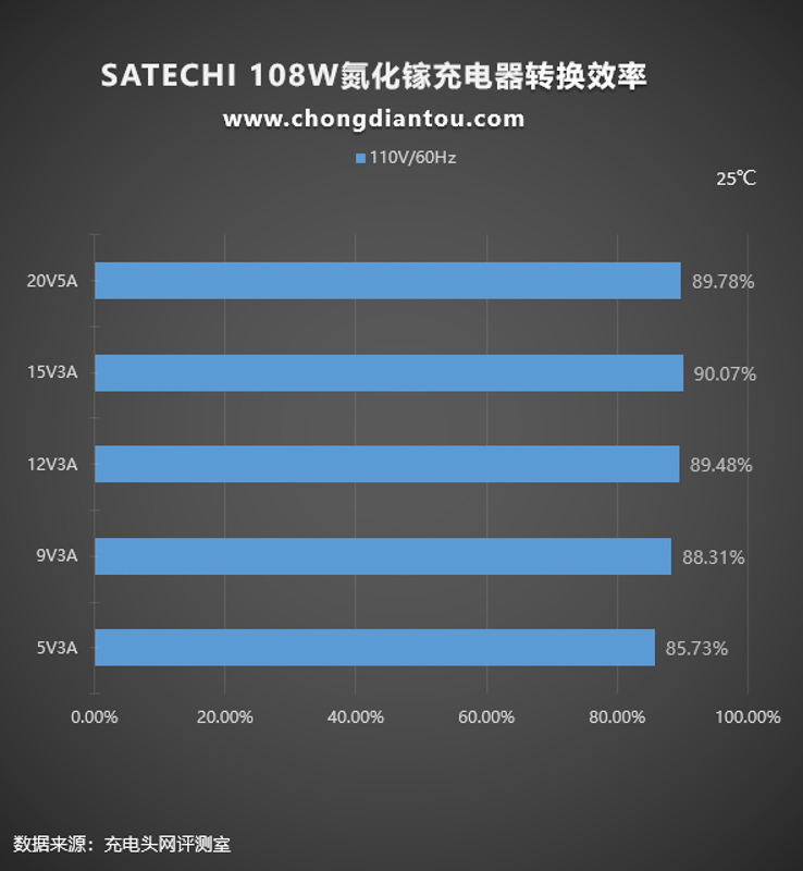 110V 60Hz下,充電器的轉換效率從85.73%到89.78%不等。