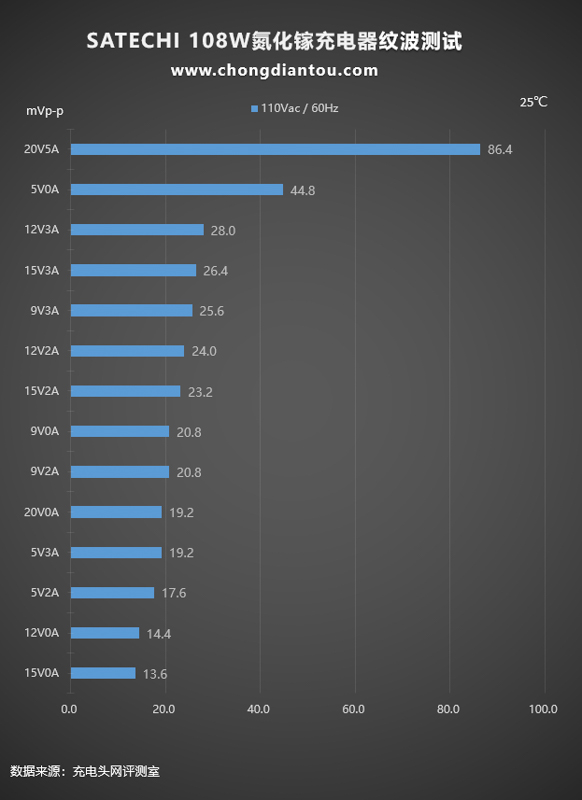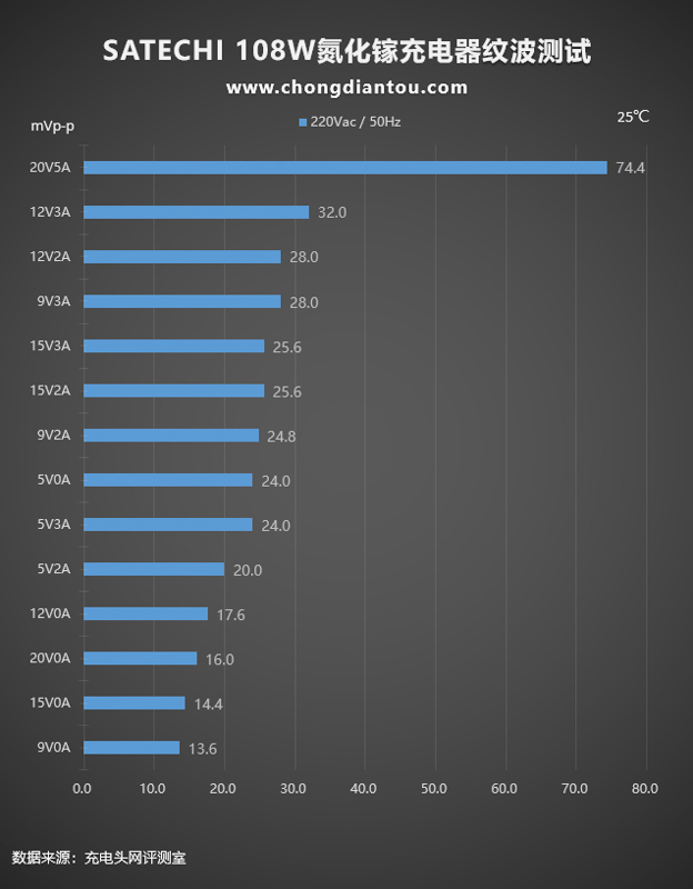 這是使用SATECHI 108W氮化鎵充電器在220V 50Hz交流輸入下的紋波測試,紋波測試分為空載(柱狀圖中Y軸電流為0A)和重載(柱狀圖中Y軸電流為非0A)兩種。紋波最高為74.4mVp-p,充電器處于20V5A輸出狀態;最低為13.6mVp-p,充電器處于9V0A空載狀態。