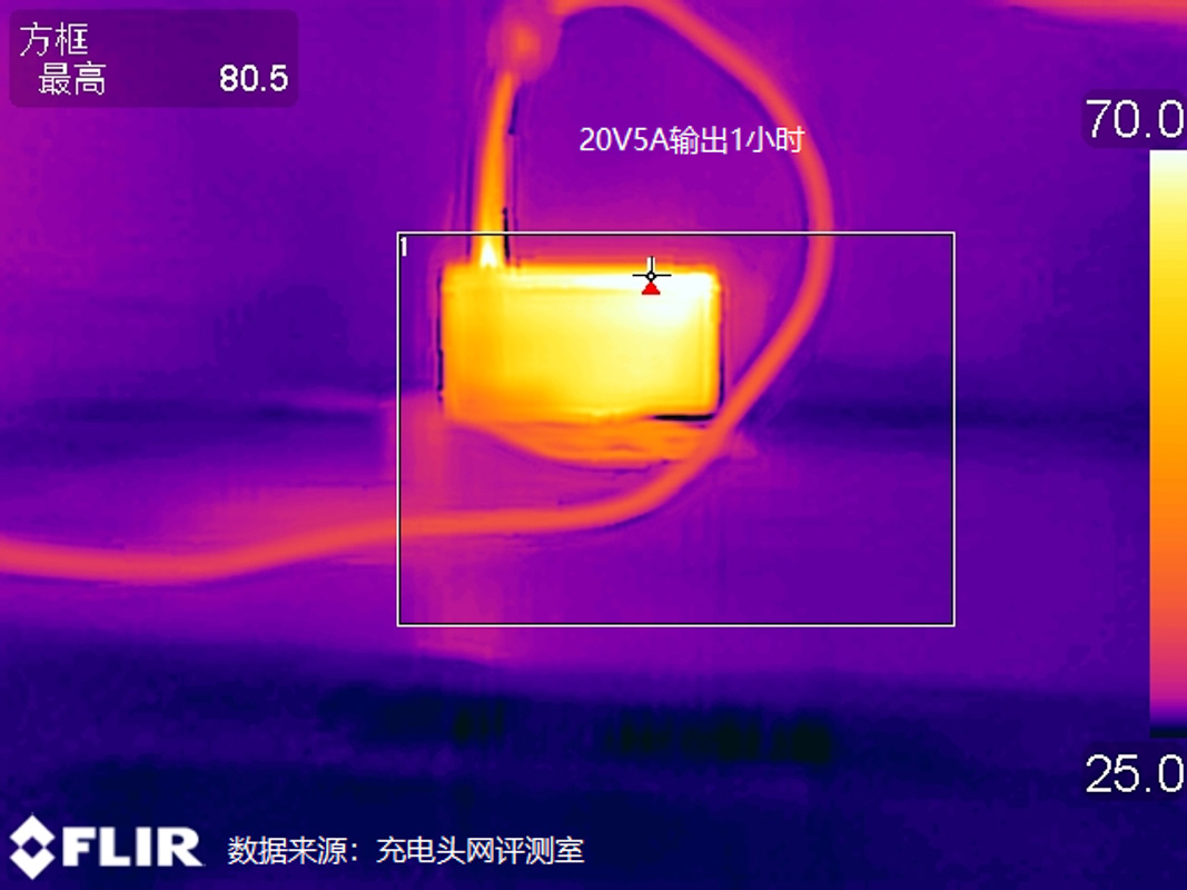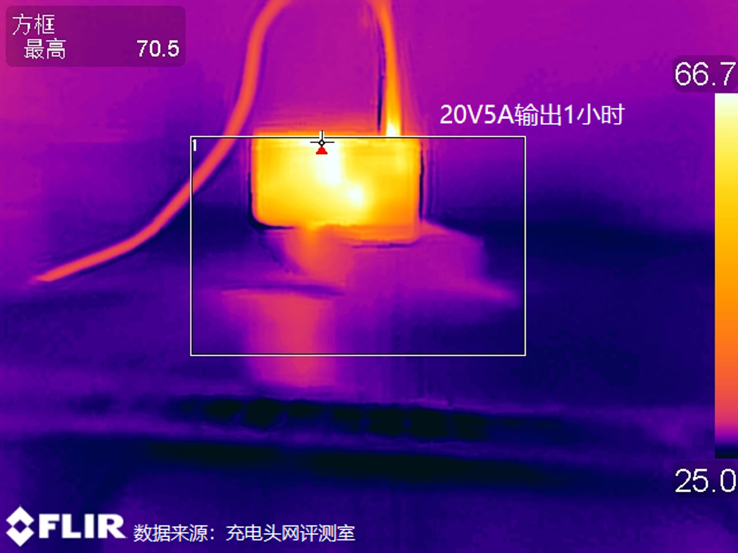 此次還對充電器的溫控方面進行了測試,測試條件為讓充電器以20V5A 100W的功率持續輸出1小時后采集表面溫度,測試基于25℃的恒溫箱內進行。
