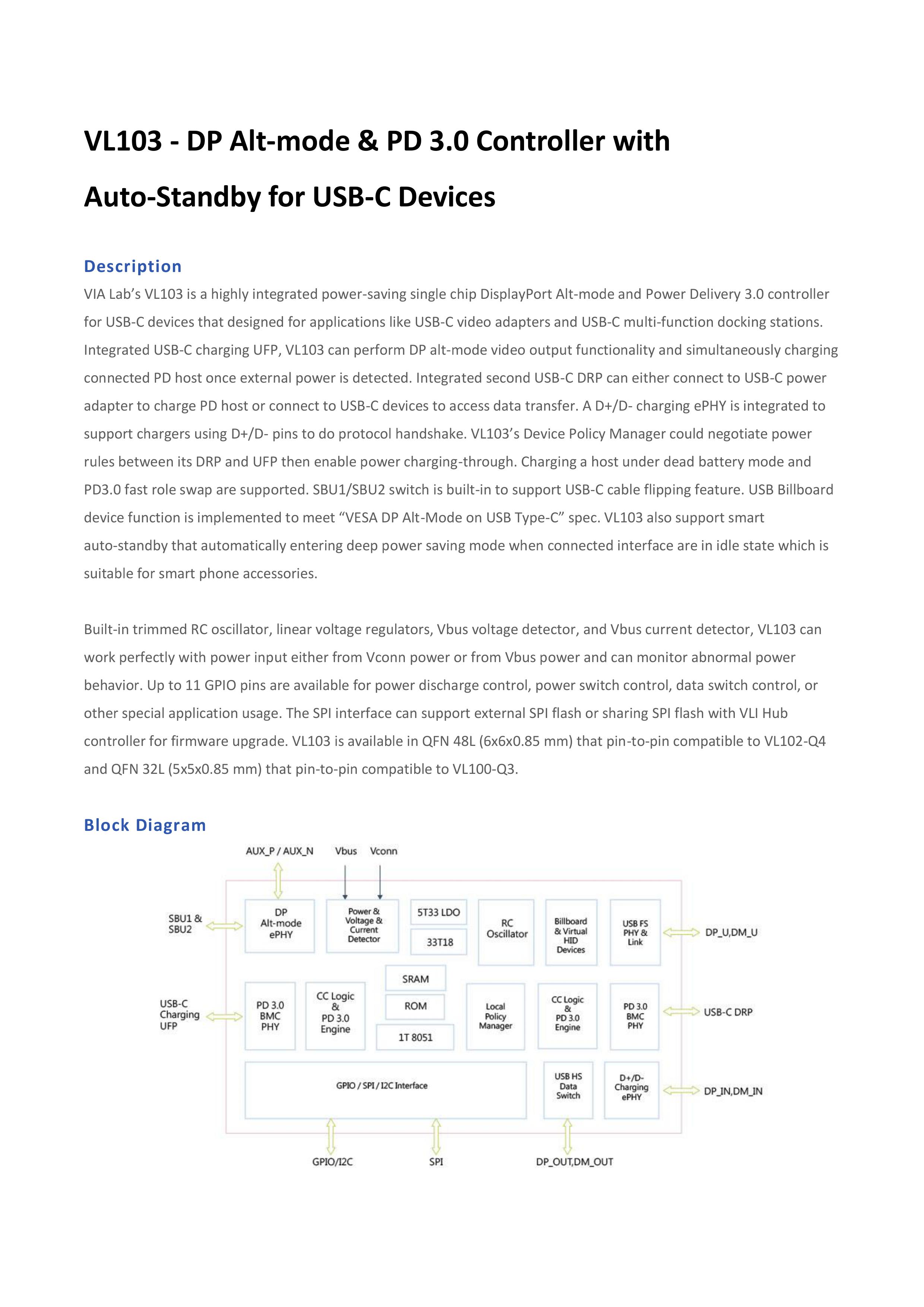 威鋒電子VL103,是一款高度集成的節(jié)能單芯片DisplayPort Alt-mode和USB PD 3.0控制器,適用于USB-C設(shè)備,專為USB-C視頻適配器和USB-C多功能擴展塢等應(yīng)用而設(shè)計,目前已獲得USB-IF協(xié)會PD 3.0認證。它是一款垂直整合各項傳輸功能的USB PD芯片,內(nèi)建Billboard,是一款可優(yōu)化USB-C周邊設(shè)備的解決方案,適用于優(yōu)化USB Type-C周邊設(shè)備、轉(zhuǎn)換器、擴展塢以及用于充電配置時可選支持Fast Role Swap協(xié)議。VL103單USB-C端口能同時支持USB數(shù)據(jù)、視頻、充電(可上達100W),且支持自動省電模式(Auto-Standby),當(dāng)USB信道無指令溝通時,VL103可自動進入休眠,實現(xiàn)智能省電。