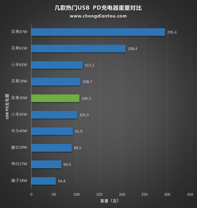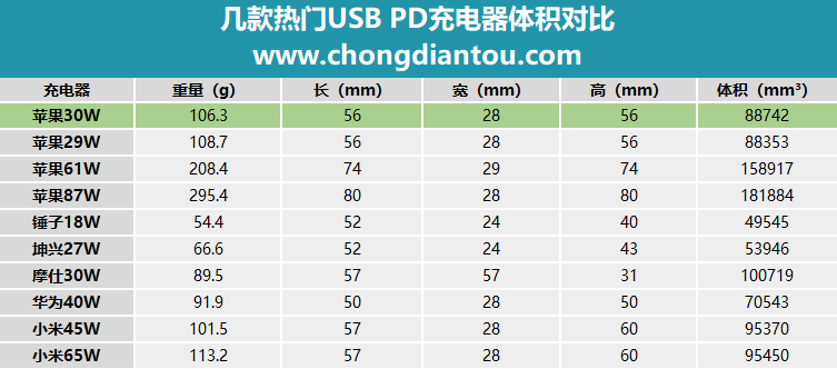 和幾款熱門的USB PD充電器體積對比,蘋果30W處于中等位置,重量超過小米45W。