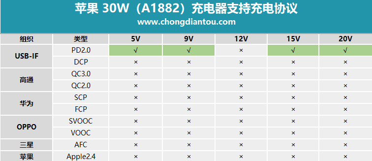 協議方面,支持的協議有USB PD2.0,如上圖“√”部分所示。