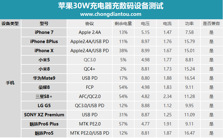 從表中可知,蘋果30W USB PD充電器可以給iPhone7設備以Apple2.4A協議充電,這是由于C-Lightning線具有協議轉換的功能,把其他協議轉換成Apple2.4A協議。給支持USB PD的iPhone 8Plus以及iPhoneX以9V USB PD協議快充。給華為小米8、Mate9、LG G5、SONY XZP、魅族Pro5等USB PD設備以9V快充,對與三星S8+、小米5、榮耀8、魅族Pro6 Plus等非USB PD的手機以5V/1.7A~1.8A充電。