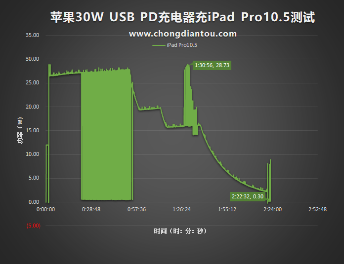 充iPad pro10.5,全程最大功率為28.73W,支持iPad Pro10.5 12V USB PD快充,充滿耗時2小時22分鐘。