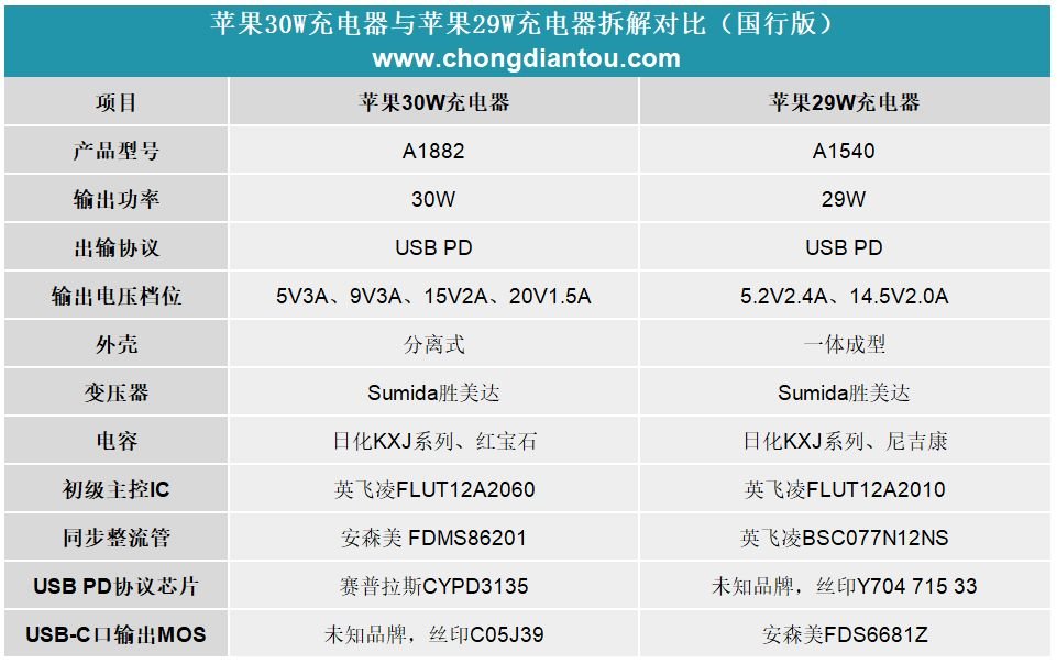 蘋果30W充電器與29W充電器詳細對比。從圖中可見無論是功率、輸出電壓、轉化效率等方面,均有大幅提升。電子產品買新不買舊,也就是這個道理。