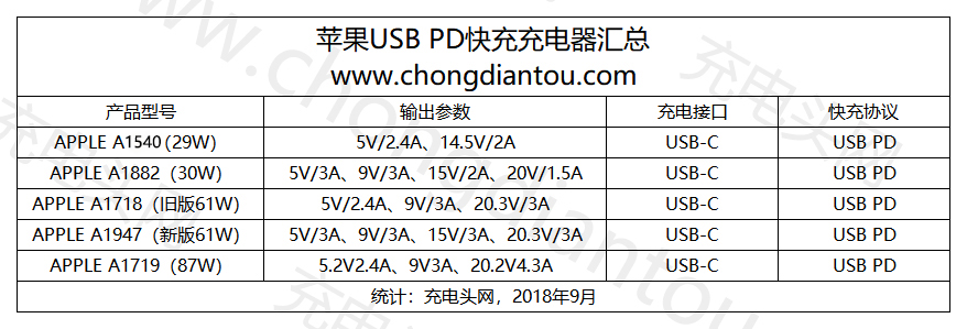 據(jù)充電頭網(wǎng)統(tǒng)計(jì),截止目前蘋果官方推出的USB PD快充充電器共有A1540(29W)、A1882(30W)、A1718(舊版61W)、A1947(新版61W)、A1719(87W)五個(gè)型號(hào)。加上市面上已有的第三方USB PD充電器,將形成豐富的充電器產(chǎn)品類目供用戶選擇。