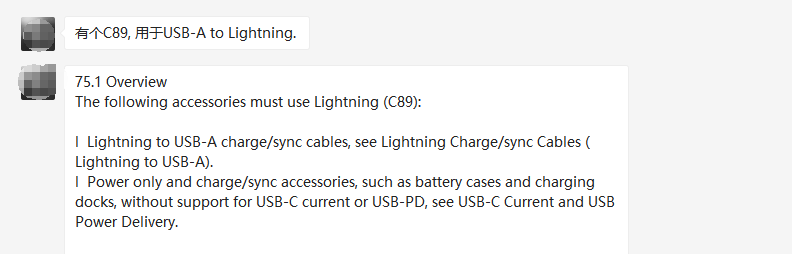 Lightning to USB-A充電/同步電纜必須使用C89連接器,該型號(hào)連接器不支持USB PD快充協(xié)議。
