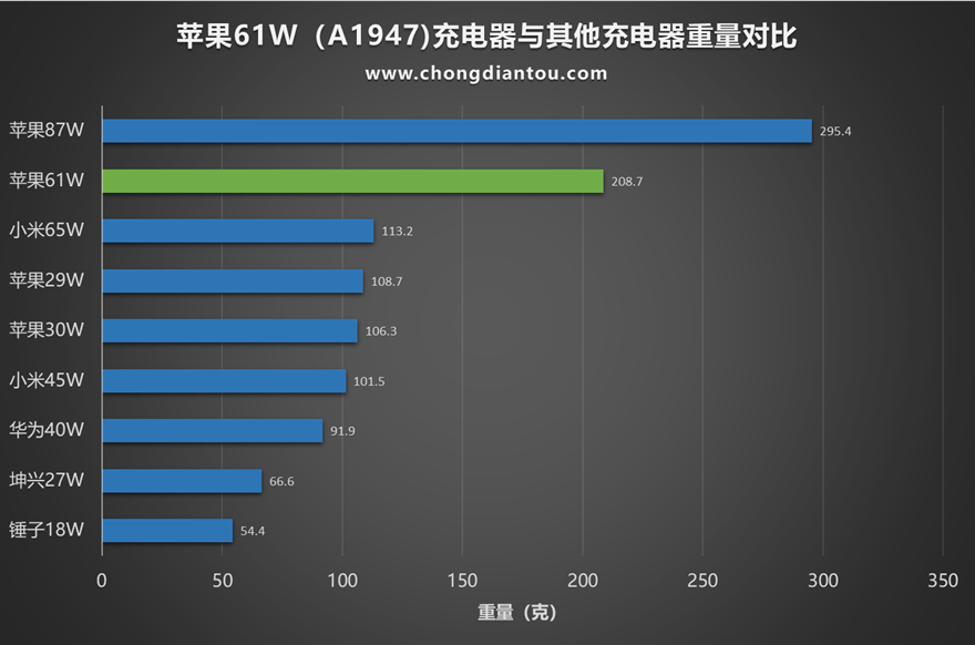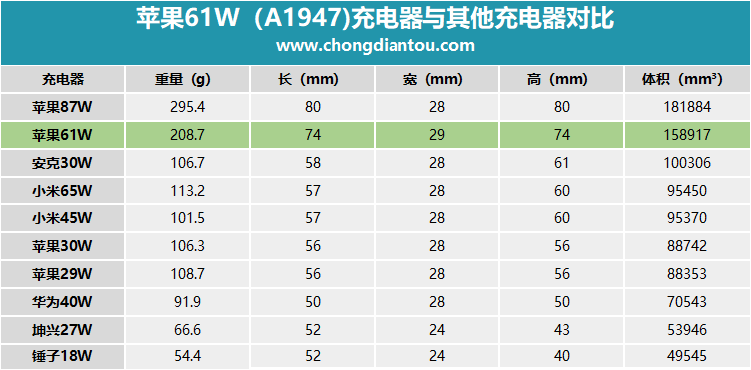 與其余幾款常見的充電器大小、重量對比,蘋果61W處于體積偏大位置,重量超過小米65W。