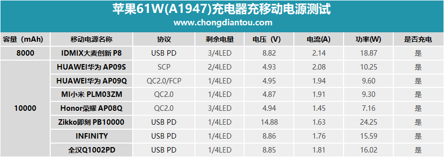 另外我還測試了一些其他移動電源的兼容性,做成了表格,如下: