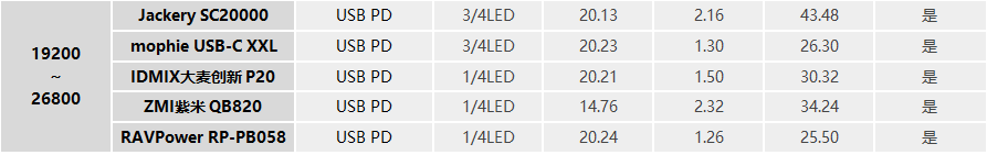 在充19200~26800mAh移動電源時,同樣是可以給支持USB PD協議的移動電源快充,尤其是Jackery、mophle、IDMIX、RAVpower這幾款移動電源,都是20V的高壓充電,Jackery更是達到了43W,充電速度很快。