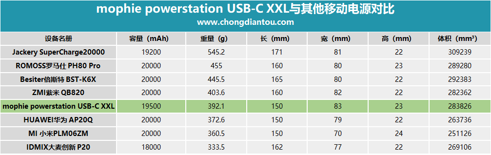移動電源全名:mophie powerstation USB-C XXL移動電源。電池容量為19500mAh/70.785Wh 3.63V(9750mAh/70.785Wh 7.26V),USB-A口支持5V/2.4A輸出,USB-C口支持5V/3A、9V/3A、15V/2A、20V/1.5A的輸入和輸出。