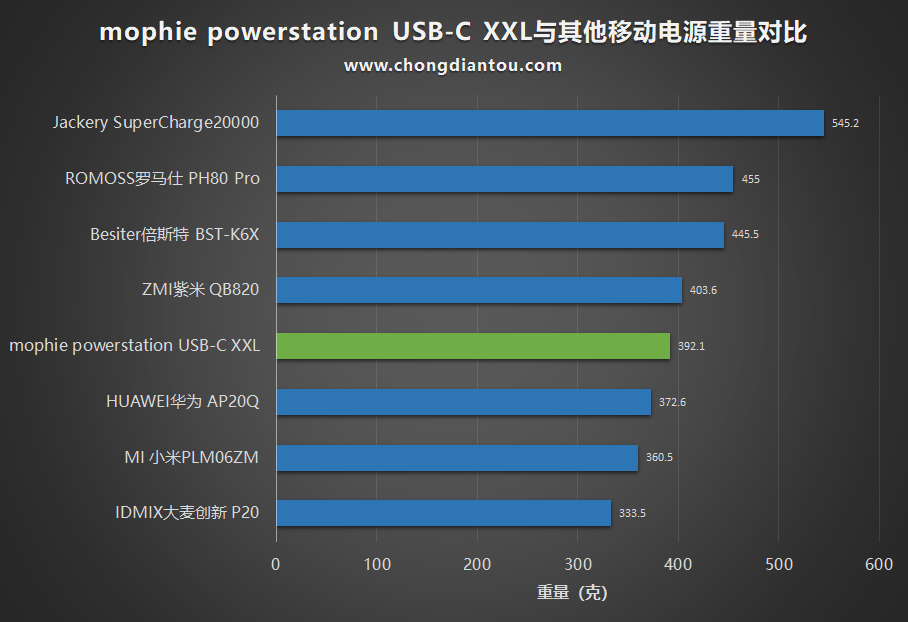 重量為392.1g,在20000mAh移動電源當中屬于中等水平,約為2.3個iPhone X的重量。
