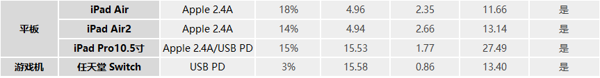 對于iPad Air、iPad Air2平板,成功握手Apple 2.4A協議,iPad Pro則優先握手了USB PD快充協議,任天堂 Swith也成功進入了USB PD快充。