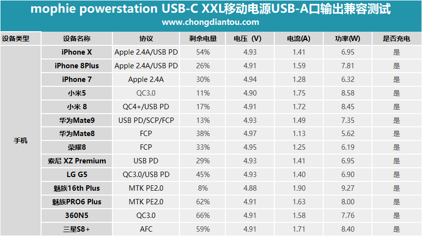從圖表中可以看出來,所有手機都能進行正常充電,兼容性良好。