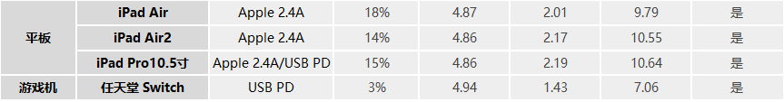 三款iPad均具有Apple 2.4A協議,移動電源的USB-A口在給它們充電時都能順利的握手Apple 2.4A協議,當前充電功率在10W左右,而在充任天堂Switch時,因為缺少快充協議的支持,所以不能給它快充,功率為7.06W。