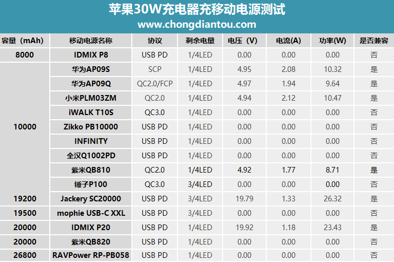 從圖表中可以看出,除了蘋果30W充電器不能充它之外,其余的充電器都能充,并且都是以充電器最大的功率對它充電。