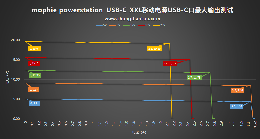 首先是USB-C口,依次設置了充電器的五個電壓檔位,電流從0A開始遞增,每次遞增0.1A。5V和9V檔位最大輸出電流為3.3A,12V檔位最大輸出電流為2.7A,15V檔位最大輸出電流為2.4A,20V檔位最大輸出電流為2.1A,比標稱值大了0.6A;最大功率可達40.29W(19.19V/2.1A),比標稱30W(20V/1.5A)功率大了10.29W,預留了10W左右的余量。
