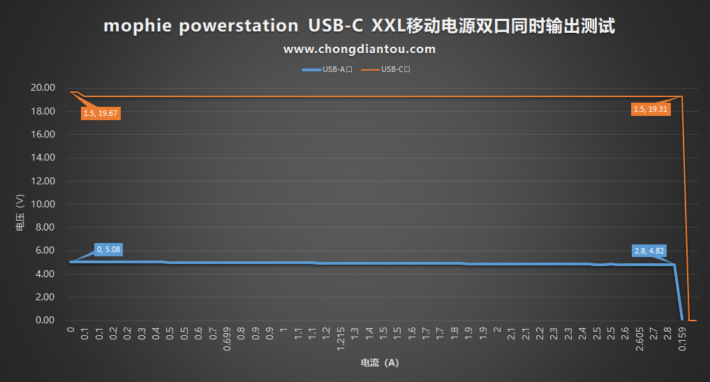 兩個輸出口同時輸出的話,最高能輸出多少呢?首先把USB-C進行誘騙在20V檔位進行輸出,在讓USB-A的輸出電流從0A逐漸遞增,每次遞增0.1A。從圖表中可以看出,USB-A口的最大輸出功率為13.49W(4.82V/2.8A),USB-C口的最大功率為28.96(19.31V/1.5A)。所以它的兩個輸出接口同時輸出時,最高可達42.49W。