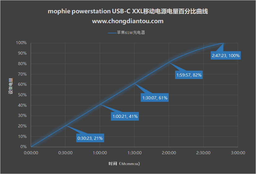首先是mophie powerstation USB-C XXL移動電源的電量變化。前兩個小時,基本上每半個小時可以充進20%左右的電量;在充電2個小時時,電量達到了82%;充滿花了近2小時48分鐘。