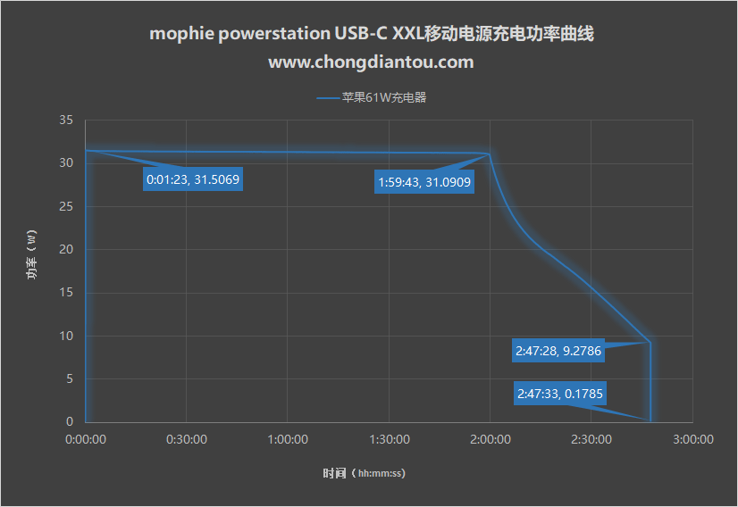 再來看看mophie powerstation USB-C XXL移動電源充電時的功率變化。在極為短暫的適配之后,功率直接上到了31W左右,并一直以31W左右的功率充電,維持了近兩個小時。在兩個小時后,電量達到80%,功率隨后逐漸下降,一直下降到9W左右;在2小時47分鐘時,電量充滿,功率隨即直線掉落到近0W。