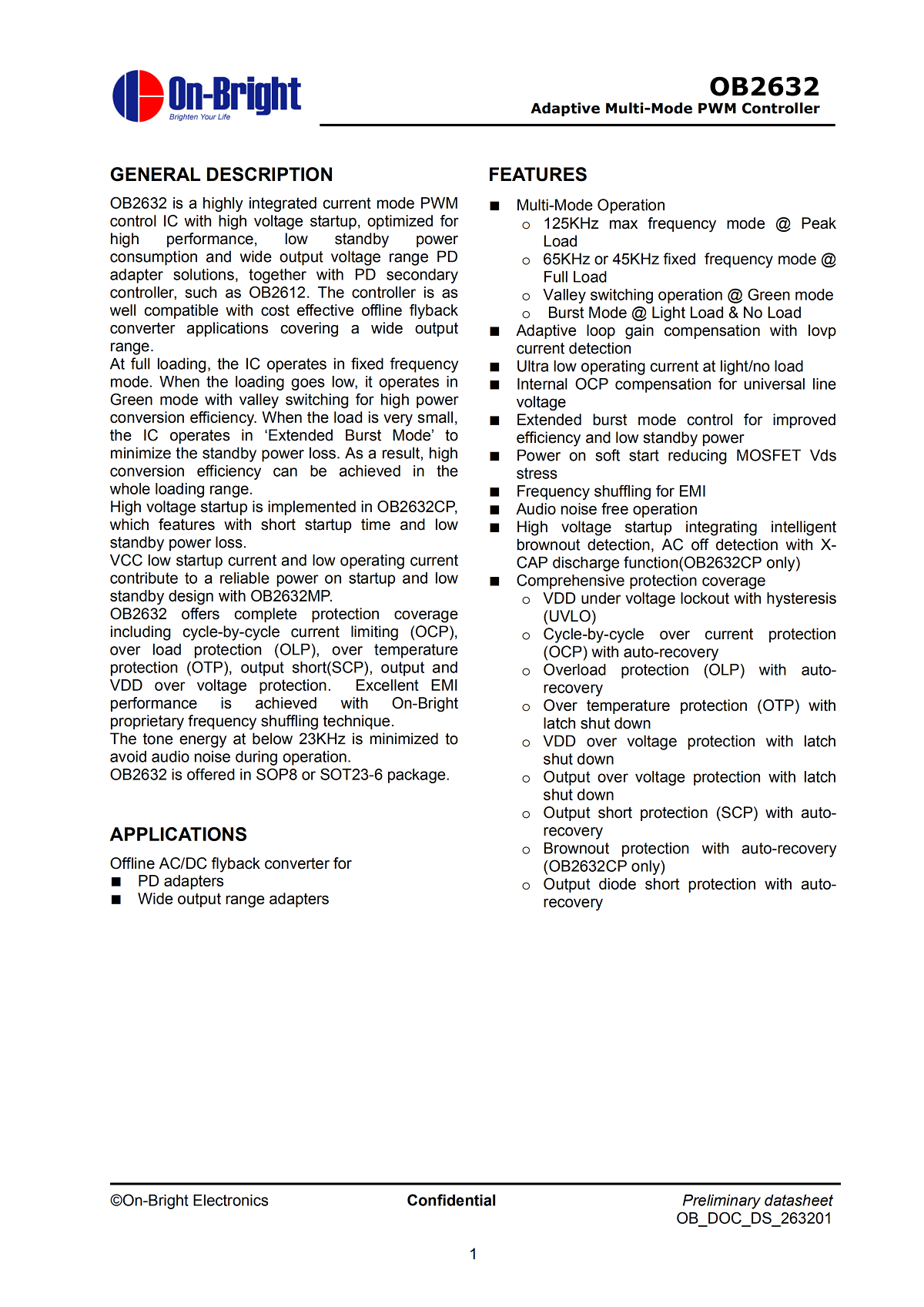 初級PWM主控芯片,絲印“532J07 340 P”,查詢得知,為昂寶OB2632。該芯片支持PD電源適配器和寬輸出范圍適配器,支持擴展的突發模式控制以提升效率和降低待機功耗,支持自恢復的逐周期電流限制和過載保護。