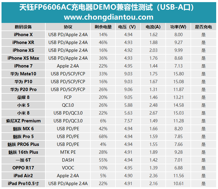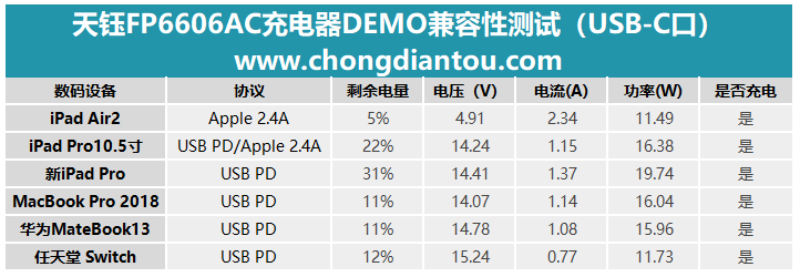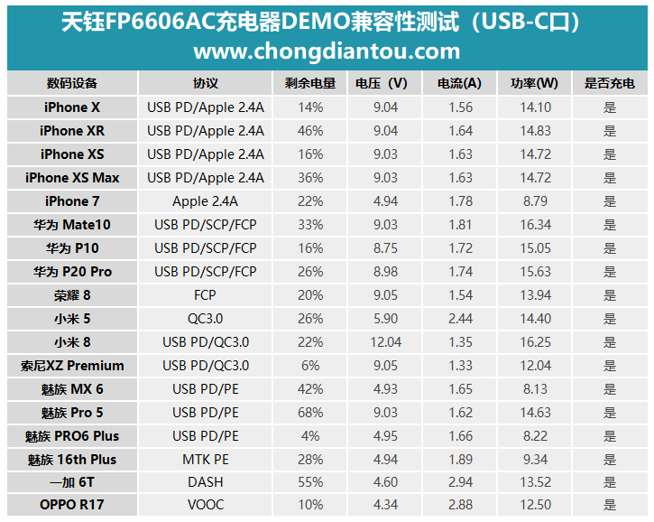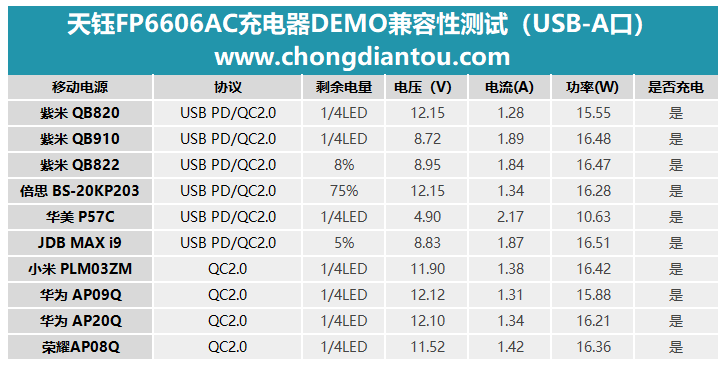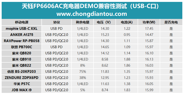 在以天鈺FP6606為中心的USB PD快充芯片矩陣中,有一款單芯片支持USB-C快充和USB-A快充的協議芯片FP6606AC,這是天鈺針對目前的市場現狀推出的一款“一芯雙充”快充芯片。 天鈺FP6606AC的功能非常強大,除了支持USB-C口實現USB PD2.0快充并有5V、9V、12V、15V四種電壓輸出檔位外,同時還可支持高通QC3.0/2.0、華為FCP、三星AFC、BC1.2等協議;USB-A口則是涵蓋了FP6601Q所有的功能,可支持QC3.0/2.0、華為FCP、三星AFC以及BC1.2等協議。 目前,充電頭網也拿到了基于天鈺FP6606AC開發的一款USB PD雙口充電器DEMO,這篇文章將為大家帶來天鈺FP6606AC充電器DEMO的兼容性測試。 一、產品外觀 該充電器DEMO公版外殼,配一個USB-A接口和一個USB-C接口。 由于是工程開發版本,內部PCBA省略了一部分電路,看起來非常簡潔。 兩個USB輸出接口特寫,其中USB-C接口與小塊PCB板組成一個插件裝配在主PCB板上。 靠近USB-C接口側采用SSOP-20封裝的芯片就是本次測試的主角——天鈺FP6606AC。 二、兼容性測試 接下來為大家帶來這款產品兼容性測試,分為USB-A口輸出兼容性和USB-C口輸出兼容性,充電頭網根據兩個接口的實際應用場景,分別測試了手機、平板電腦、移動電源、筆記本電腦等數十款設備。 1、協議檢測 使用ChargerLAB POWER-Z FL001SUPER檢測USB-A接口的輸出兼容性,顯示支持APPLE 2.4A、QC2.0、QC3.0、FCP、AFC等協議。 對于USB-C接口而言,除了支持APPLE 2.4A、QC2.0、QC3.0、FCP、AFC等協議之外,還支持USB PD快充協議。 在USB PD快充協議下,充電器的PDO報文有四組輸出電壓檔位,分別是5V/3A、9V/2A、12V/1.5A、15V/1.2A,最大輸出功率為18W。 2、USB-A口輸出兼容性 給iPhone XS Max充電(剩余36%電量),充電電壓4.93V,電流1.76A,充電功率約8.72W,支持APPLE 2.4A充電協議。 給iPhone XS充電(剩余16%電量),充電電壓4.92V,電流2.03A,充電功率約10W,支持APPLE 2.4A充電協議。 給iPhone X充電(剩余14%電量),充電電壓4.94V,電流1.62A,充電功率約8.02W,支持APPLE 2.4A充電協議。 給iPhone XR充電(剩余46%電量),充電電壓4.93V,電流1.88A,充電功率約9.3W,支持APPLE 2.4A充電協議。給iPhone 7充電(剩余22%電量),充電電壓4.95V,電流1.44A,充電功率約7.16W,支持APPLE 2.4A充電協議。 給華為P20 Pro充電(剩余26%電量),充電電壓9.06V,電流1.31A,充電功率約11.95W,支持FCP快充。 給華為P10充電(剩余16%電量),充電電壓9.03V,電流1.67A,充電功率約15.15W,支持FCP快充。 給華為Mate 10充電(剩余33%電量),充電電壓9.03V,電流1.75A,充電功率約15.81W,支持FCP快充。 給榮耀 8充電(剩余20%電量),充電電壓9.05V,電流1.46A,充電功率約13.22W,支持FCP快充。 給小米 8充電(剩余22%電量),充電電壓5.63V,電流2.67A,充電功率約15.09W,支持QC3.0快充。 給小米 5充電(剩余26%電量),充電電壓5.88V,電流2.48A,充電功率約14.66W,支持QC3.0快充。 給三星Note 9充電(剩余電量77%),充電電壓9.06V,電流1.46A,充電功率約1.25W,支持AFC快充。 給索尼XZ Premium充電(剩余6%電量),充電電壓7.57V,電流1.49A,充電功率約11.29W,支持QC3.0快充。 給魅族 MX6充電(剩余19%電量),充電電壓4.94V,電流1.66A,充電功率約8.2W,手機可以正常充電。 給魅族 Pro5充電(剩余68%電量),充電電壓4.94V,電流1.59A,充電功率約7.87W,手機正常充電。 給魅族 Pro6 Plus充電(剩余4%電量),充電電壓4.94V,電流1.55A,充電功率約7.7W,手機正常充電。 給魅族 16th Plus充電(剩余28%電量),充電電壓4.91V,電流1.89A,充電功率約9.33W,手機正常充電。 給OPPO R17充電(剩余10%電量),充電電壓4.95V,電流1.39A,充電功率約6.89W,手機正常充電。 給一加 6T充電(剩余55%電量),充電電壓4.94V,電流1.4A,充電功率約7.06W,手機正常充電。 給iPad Air2充電(剩余5%電量),充電電壓4.9V,電流2.36A,充電功率約11.58W,支持APPLE 2.4A充電協議。 給10.5寸的iPad Pro充電(剩余55%電量),充電電壓4.91V,電流2.16A,充電功率約10.61W,支持APPLE 2.4A充電協議。 測試發現,天鈺FP6606AC充電器DEMO的USB-A口支持iPhone手機充電,充電速度要比手機原裝充電器更快,同時也支持華為、小米、三星、索尼等品牌手機高壓快充,對于其他品牌的手機也能正常充電。 接下來進行的USB-A口對移動電源的兼容性測試: 給倍思 BS-20KP203充電(剩余1/4電量),充電電壓12.15V,電流1.34A,充電功率約16.35W,支持快充。 給紫米 QB910充電(剩余1/4電量),充電電壓8.72V,電流1.89A,充電功率約16.55W,支持快充。 給紫米 QB822充電(剩余8%電量),充電電壓8.95V,電流1.84A,充電功率約16.53W,支持快充。 給紫米 QB820充電(剩余1/4電量),充電電壓12.15V,電流1.28A,充電功率約15.61W,支持快充。 給JDB MAX i9充電(剩余50%電量),充電電壓8.83V,電流1.87A,充電功率約16.54W,支持快充。 給華美 P57C充電(剩余1/4電量),充電電壓4.9V,電流2.17A,充電功率約10.65W,移動電源正常充電。 給小米PLM03ZM充電(剩余1/4電量),充電電壓11.9V,電流1.38A,充電功率約16.47W,支持快充。 給華為AP09Q充電(剩余1/4電量),充電電壓12.12V,電流1.31A,充電功率約15.98W,支持QC2.0快充。 給華為AP20Q充電(剩余1/4%電量),充電電壓12.1V,電流1.34A,充電功率約16.34W,支持快充。 給榮耀AP08Q充電(剩余1/4電量),充電電壓11.52V,電流1.42A,充電功率約16.41W,支持快充。 對于市面上常見的品牌移動電源,天鈺FP6606AC充電器DEMO的USB-A口基本都能對這些設備進行高壓快充。 接下來我們再看一下USB-C口的輸出兼容性: 3、USB-C口輸出兼容性 給iPhone XS Max充電(剩余36%電量),充電電壓9.03V,電流1.63A,充電功率約14.75W,支持USB PD快充。 給iPhone XS充電(剩余16%電量),充電電壓9.03V,電流1.63A,充電功率