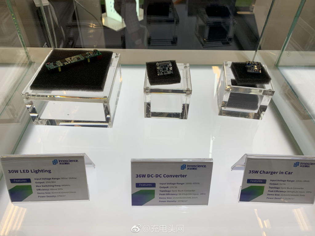 APEC2019上,中國(guó)氮化鎵代表企業(yè)英諾賽科展示了8英寸硅基氮化鎵晶圓、功率器件、功率模塊等。