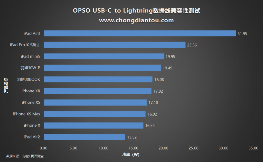 小編把測(cè)試數(shù)碼數(shù)碼產(chǎn)品兼容性的數(shù)據(jù)做了個(gè)表格,可以到OPSO USB-C to Lightning數(shù)據(jù)線均能給所測(cè)試支持PD快充的蘋果設(shè)備開啟快充,像iPad Air2不支持PD快充的設(shè)備它也能為它激活A(yù)pple 2.4A協(xié)議充電。