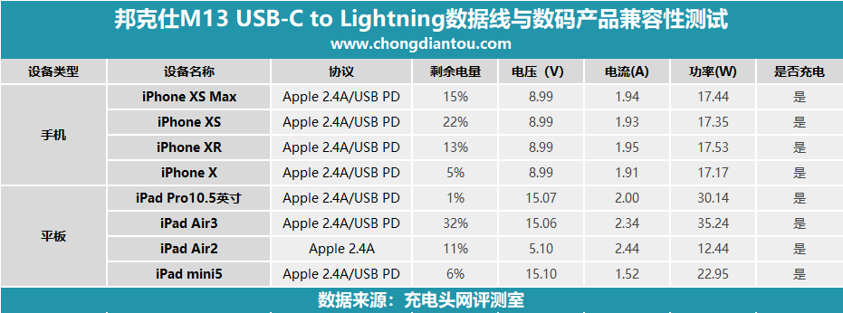 小編把測試數碼數碼產品兼容性的數據做了個表格,可以看到邦克仕M13 USB-C to Lightning數據線均能給所測試支持PD快充的蘋果設備開啟快充,像iPad Air2不支持PD快充的設備它也能為它激活Apple 2.4A協議充電。