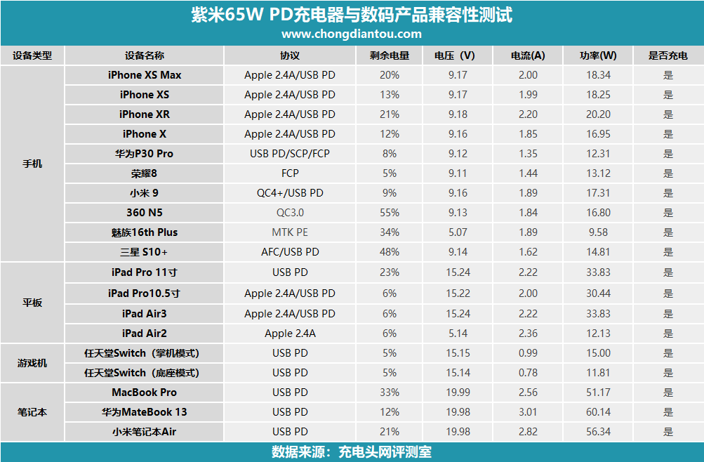 紫米65W PD充電器與手機、平板、筆記本等數(shù)碼產(chǎn)品的兼容性十分不錯,均能為其充電,同時也為支持PD、QC、FCP快充的設(shè)備開啟了相對應(yīng)的快充。