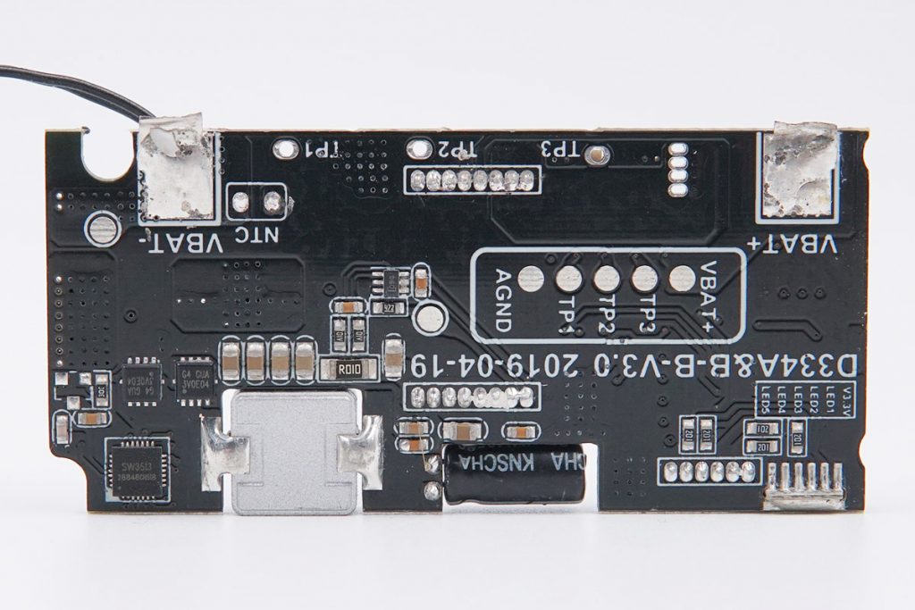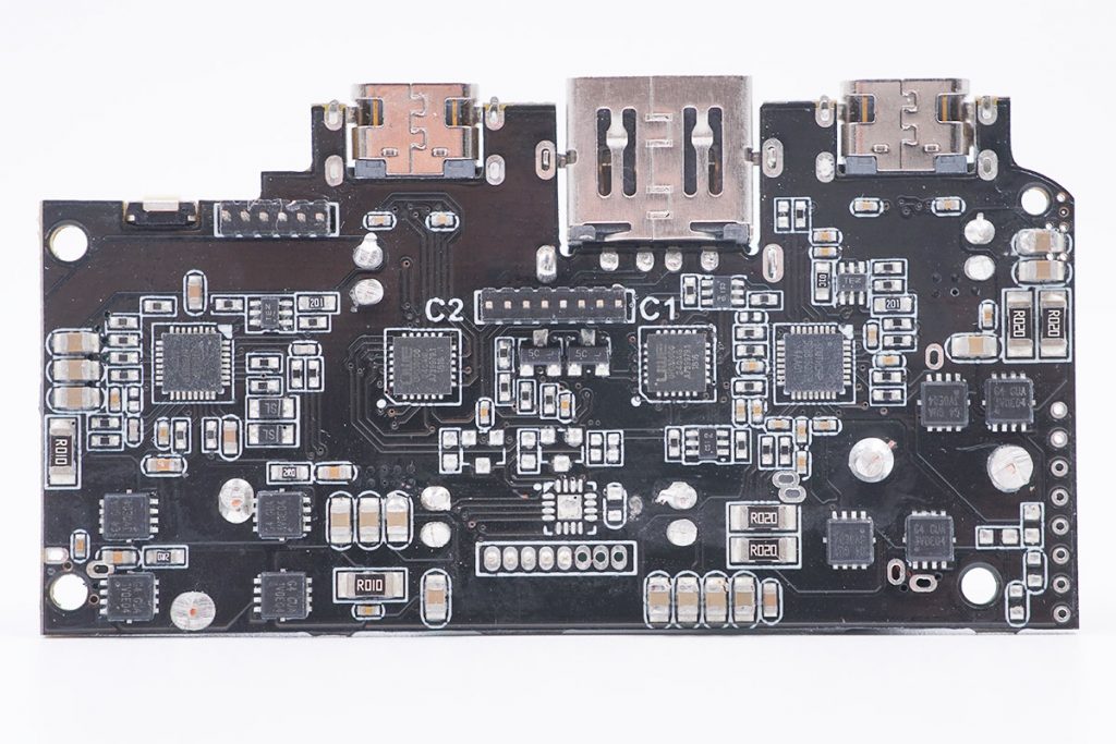 通過拆解可以看到,這款綠巨能100W移動(dòng)電源配內(nèi)部堆疊十分復(fù)雜,采用了雙層主板設(shè)計(jì),8顆三星的35E 18650電芯。升降壓控制器芯片采用南芯半導(dǎo)體的SC8815,以及一顆南芯southchip SC8701同步4管升降壓控制器。同時(shí)還有兩顆優(yōu)微科技UPD300DO-24QAIG接口控制器、PD控制器二合一ASIC芯片,并經(jīng)過USB PD認(rèn)證。可以做到三口同時(shí)輸出最大功率約為130W,一起沖充兩臺(tái)筆記本電腦也足夠了。