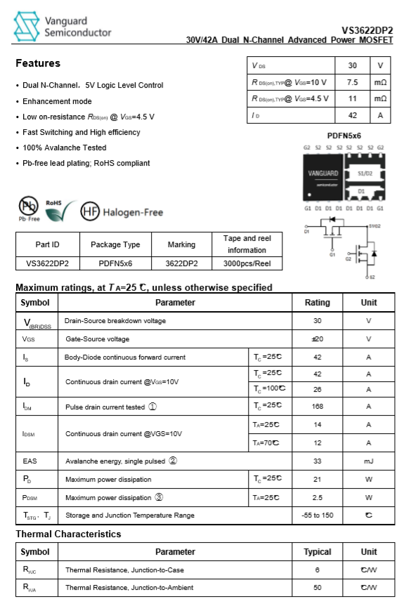 威兆 VS3622DP2 雙NMOS管,用于無線充電線圈驅動。邏輯電壓驅動,更好適配無線充電主控。內置雙MOS,兩顆即可組成完整全橋。