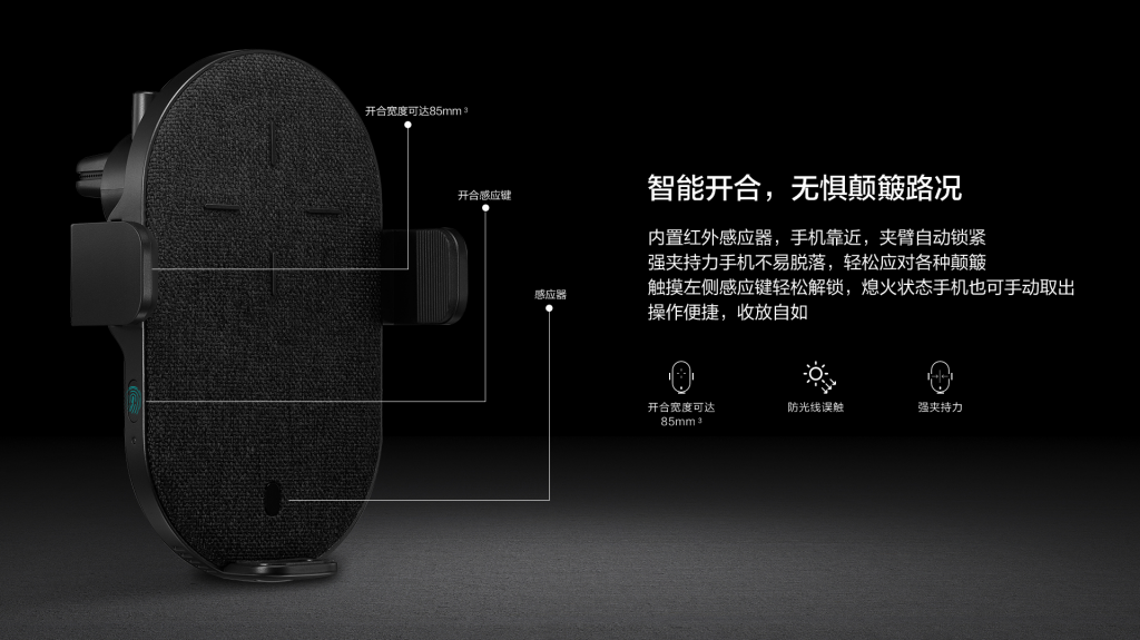 智能開合感應,內置紅外感應器,手機靠近,夾臂自動縮緊。強夾持力手機不易脫落,輕松應對各種顛簸。觸摸左側感應鍵輕松解鎖,熄火狀態(tài)手機也可手動取出。操作便捷,收放自如。
