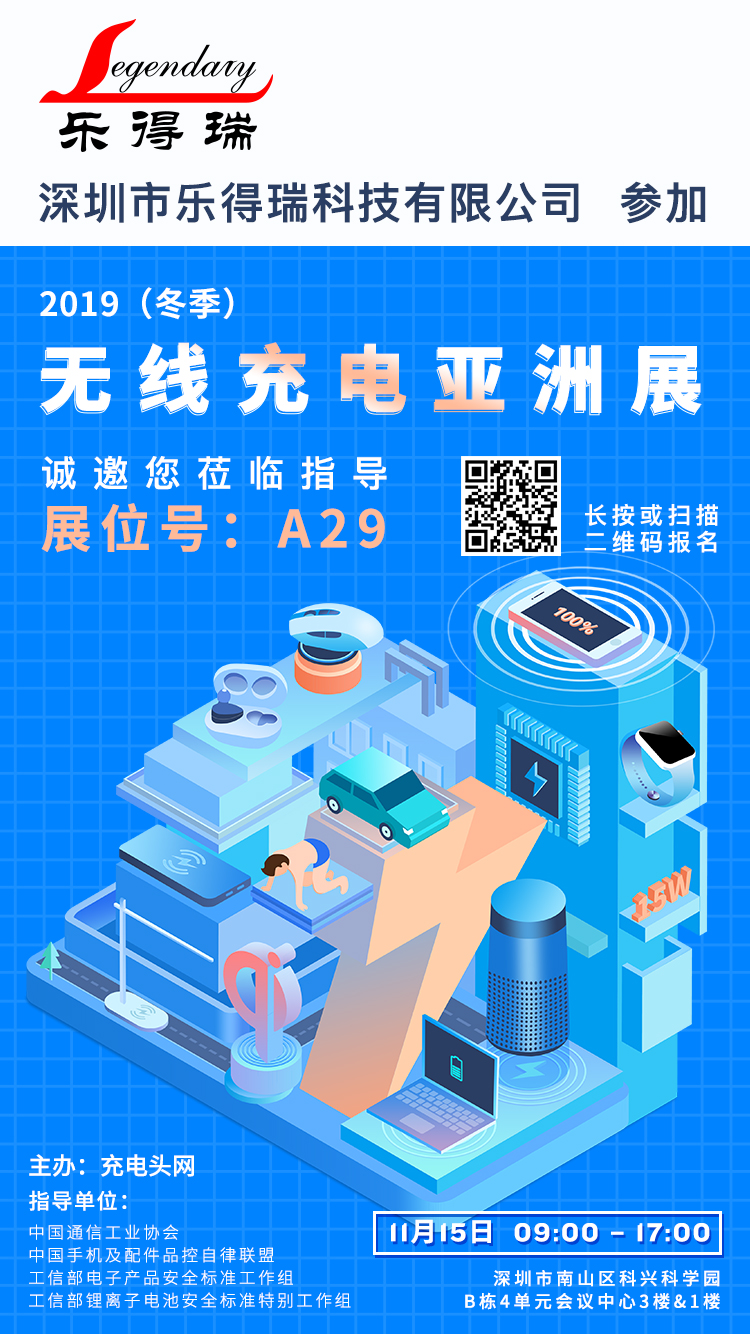 溫馨提示:樂得瑞 將參加11月15日中國深圳召開的2019(冬季)無線充電亞洲展,展位設在A29,需要了解無線充PD/QC供電解決方案的觀眾,可在展會當天前往展位詳細交流。
