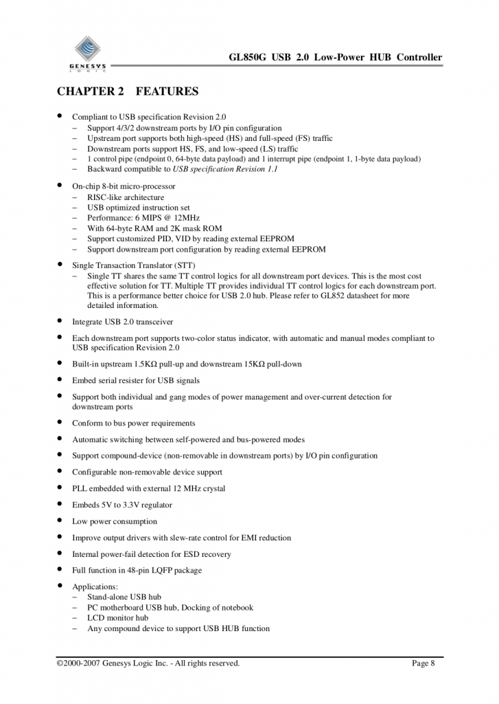 USB2.0 HUB芯片GL850G,這是創惟科技的高級版本集線器解決方案,完全符合通用串行總線規范修訂版2.0。GL850G繼承了創惟科技的尖端技術,以節省成本和降低功耗的串行接口設計。與全球所有USB2.0集線器解決方案相比,GL850G具有公認的兼容性,更低的功耗系數和更好的成本結構。