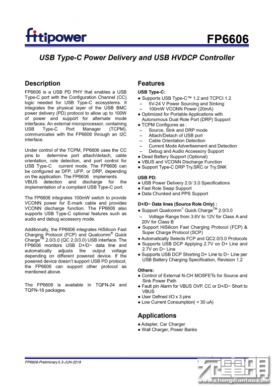 目前FP6606已經通過了USB IF協會的PD3.0認證,TID號為302。可應用于USB PD快充充電器、USB PD快充車充等產品中。