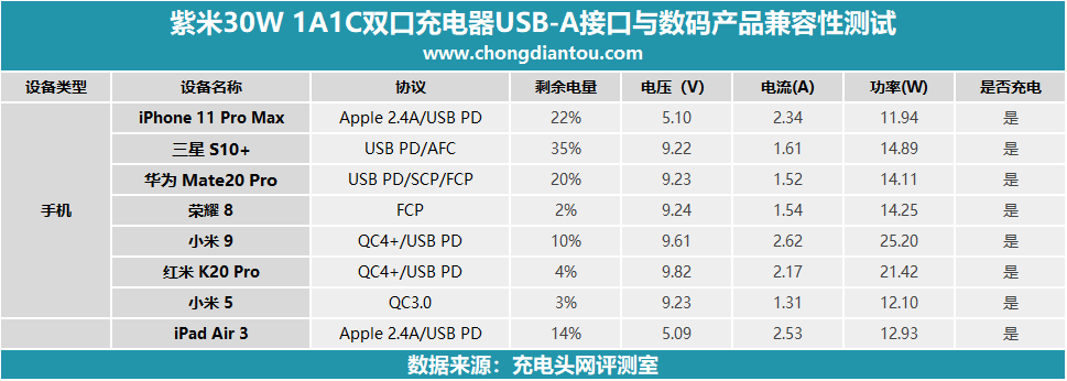 下面是紫米30W 1A1C雙口充電器USB-A接口兼容性實測。