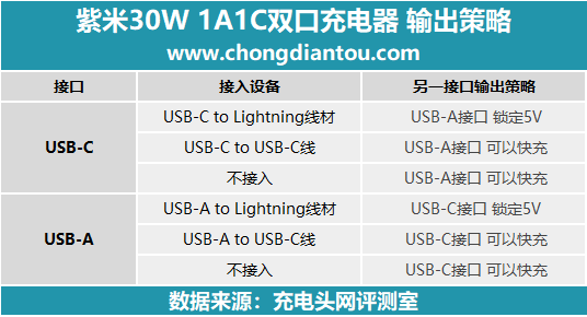 紫米30W 1A1C雙口充電器在一個接口無電流時,不會影響另一個接口的快充輸出,在某個接口有電流時(插入帶芯片的蘋果數據線),雙口全部鎖定5V。這是因為單路多口的充電器都會檢測輸出口的使用情況,如果某一個接口隨意升壓會影響另外接口的輸出情況,引發安全問題。普通的數據線沒有功耗,充電器檢測不到其插入設備,另一個接口可以正常輸出。而蘋果數據線內部擁有MFi認證的芯片,接入時會有電流產生,充電器認為該接口正在使用,為了保障安全,充電器會強制將兩個接口鎖定在5V輸出。