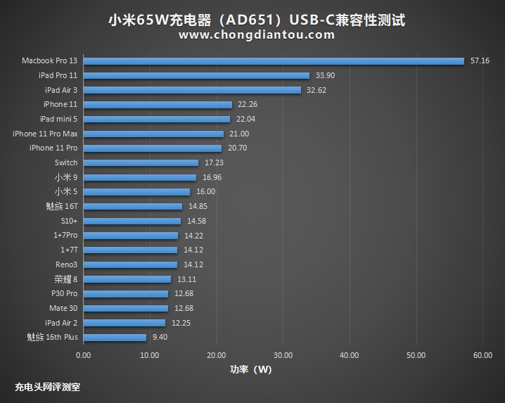 將數據繪制成直觀的柱狀圖,iPhone 11系列的功率都超過了20W,其他主流安卓設備在12-16W之間,兩臺大尺寸iPad平板功率超過了30W,為Macbook Pro筆記本充電可達到57W。