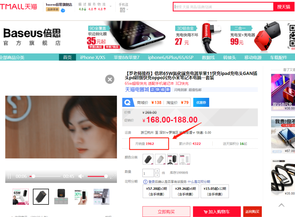 在直播開始之間,充電頭網特意在倍思天貓旗艦帶店截取了一份銷量數據,此時月銷量為1962臺。